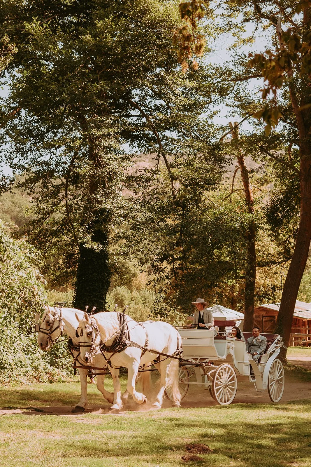 Make your grand entrance in a beautifully adorned horse-drawn carriage — the perfect fairytale touch for your wedding day.